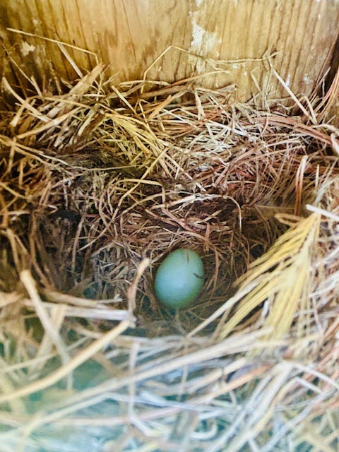 But the big family Easter Dinner always falls on us. This year, preparations are occurring smack in the middle of my wife having to guest-preach a Good Friday sermon at our church (on one of the last seven sayings of Jesus on the cross — “My God, my God, why hast thou forsaken me” — a question I ask as often as possible. JK, God!) So it is left to me to clean up the yard, select the menu, grocery shop, make dinner, slop the hogs, get behind the mule, and tend to new life, as my bluebird pair has returned and gotten busy, laying their first egg as I deport their arch-nemeses invaders, the sparrows. Who are thinner on the ground this year, as I believe word has gotten out in the sparrow community about Uncle Blaine’s catch-and-release sparrow trap.